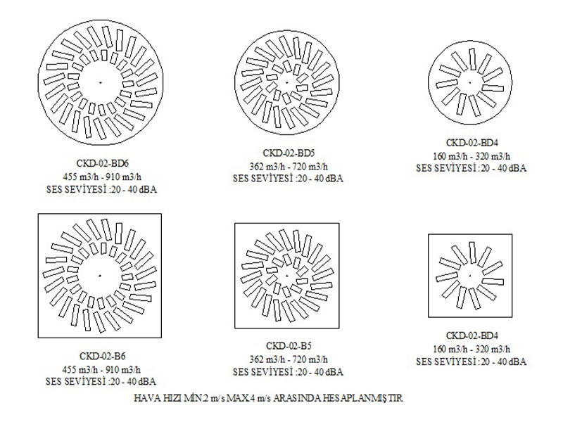 It is used as blowing diffusers in Hvac systems. It is suitable for vertical shooting. The ideal shooting distance is between 2.5-4 m. It is used in ceiling applications. Standard production is screwless in square ceilings. Other sizes are standard manufacturing screw. The way of mounting can be changed optionally.