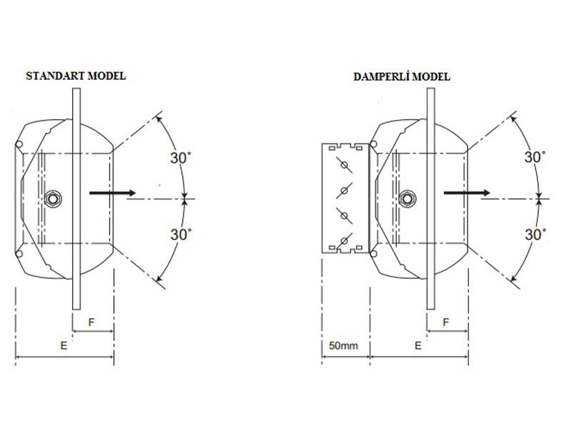 Hvac sistemlerinde üfleme difüzörleri olarak kullanılmaktadır. Yatay kullanım için uygundur. İdeal atış mesafesi 3,5 m -15 m.arasındadır. Yüksek debi ve uzun atış mesafelerinin gerekli olduğu spor salonları avm ,fabrika binaları ve konferans salonları benzeri mekanlarda ısıtma ve soğutma amaçlı kullanılır.Standart vida montajlıdır. Montaj şekli isteğe bağlı olarak değiştirilebilir.