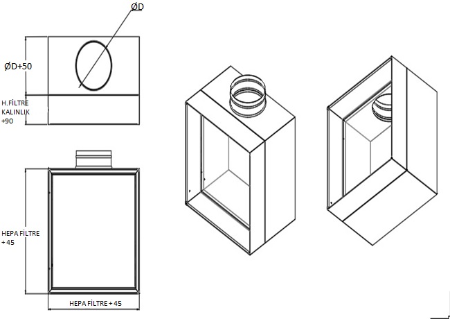 CKF-01/01A Hepa filtre kutuları hijyenin gerekli olduğu mekânlarda hepa filtre ve difüzör ile beraber kullanılır. Hepa filtre tam sızdırmaz özeliğine sahip yapıda imal edilir. Fitre ve difuzor sık sık sökülmesi gerektiği için montajı kolay şekilde dizayn edilmiştir. Hepa filtre kutuları şantiye ortamındaki şartlar göz önüne alınarak hava girişleri yandan veya üstten olarak iki şekilde imal edilir. Clip-in tavan uygulamalarında ilave kör kasa kullanılır.